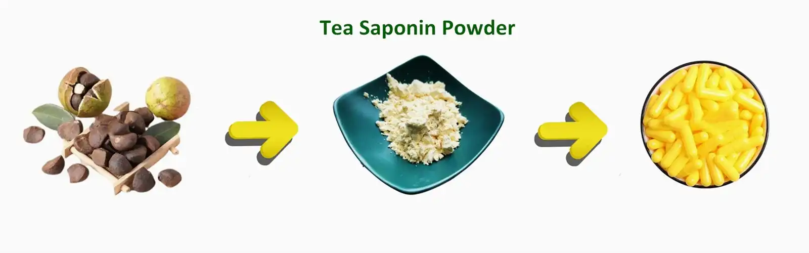 Tea saponin Powder, also known as tea saponins, are usually divided into tea saponins and tea seed saponins. They are a class of saponin compounds extracted from (tea, camellia, camellia oleifera). Tea saponins have a hemolytic effect and are difficult to dissolve in cold water. They are also a pure natural nonionic surfactant, with hydrophilic sugar bodies and hydrophobic ligand groups in the molecules. Therefore, it has a variety of surface activities such as emulsification, dispersion, wetting, decontamination, foaming, and foam stabilization, especially has a strong foaming ability, and the generated foam is stable and not affected by the hardness of water quality.